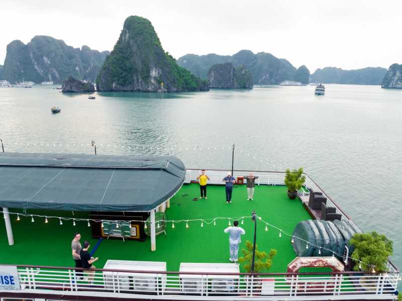 06:00 Warm up your day with a Tai Chi lesson on the sundeck with a breathtaking view as the sunrises on Halong Bay. Sunrise photo-hunting in the bay is once a lifetime experience; however, this activity is not mandatory. You can choose to stay in bed.