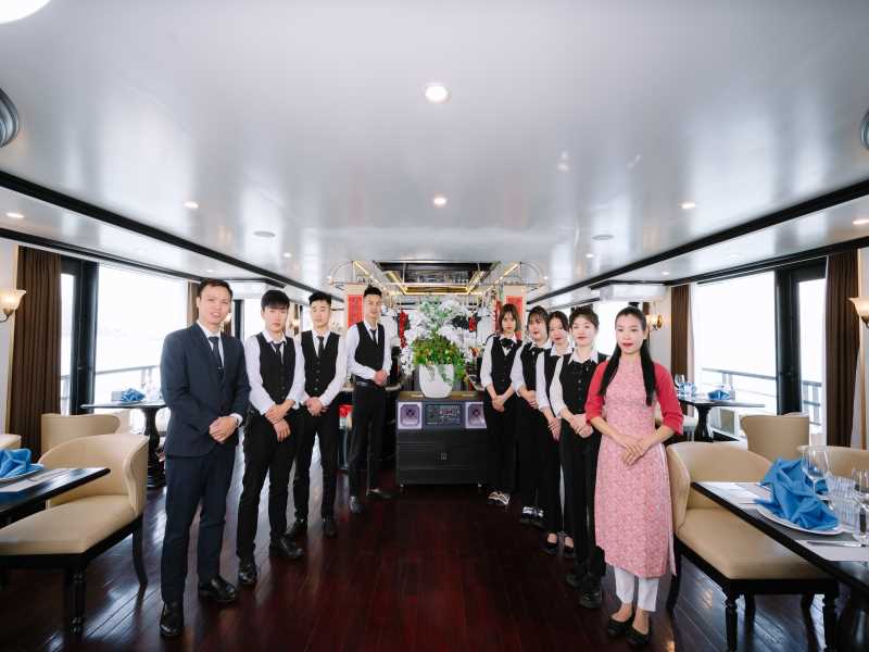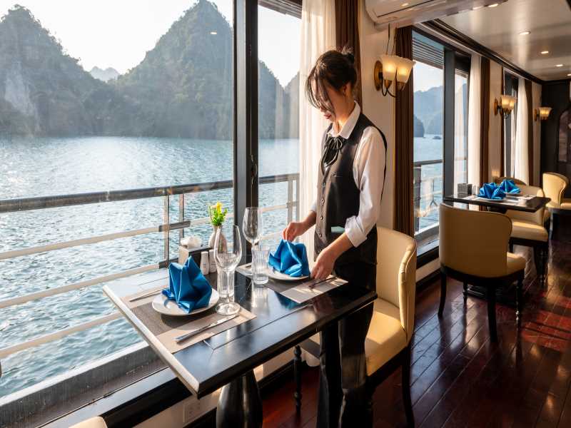 12:30. The Cruise Manager and crew member welcome you onboard with guiding information and a safety briefing. Enjoy a fabulous lunch in our restaurant. During lunch time, our cruise starts to sail through the magnificent Lan Ha Bay, a geological extension of Halong Bay which is less visited, less inhabited and therefore has the extra appeal of being a more peaceful place. Check in your cabin.