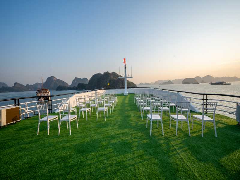 17:00. We return to Dragonbay Premium Cruise and join some interesting activities such as cooking demonstration, sunset party and relaxing on the sundeck to catch the daily spectacular of a gorgeous panorama. Don’t miss the Happy Hour at our bar as well. After that, the captain will let the cruise stop at a quiet area of the bay.