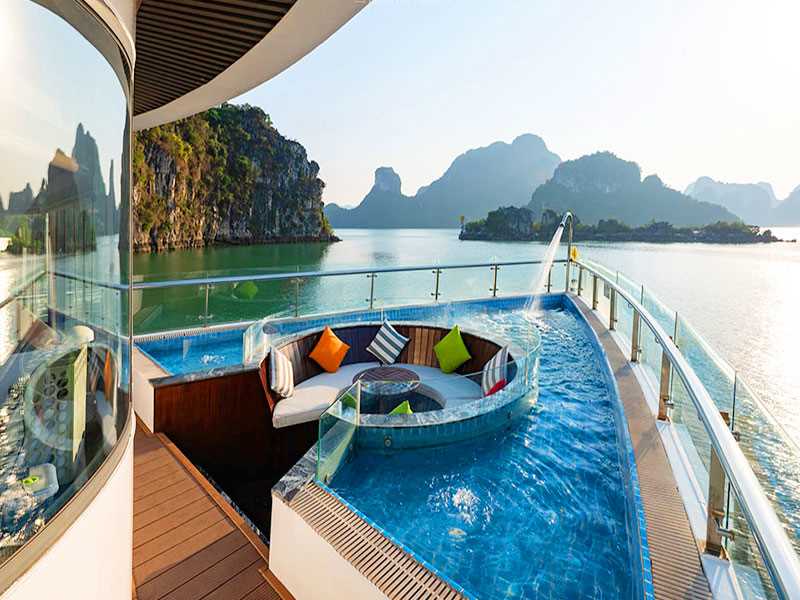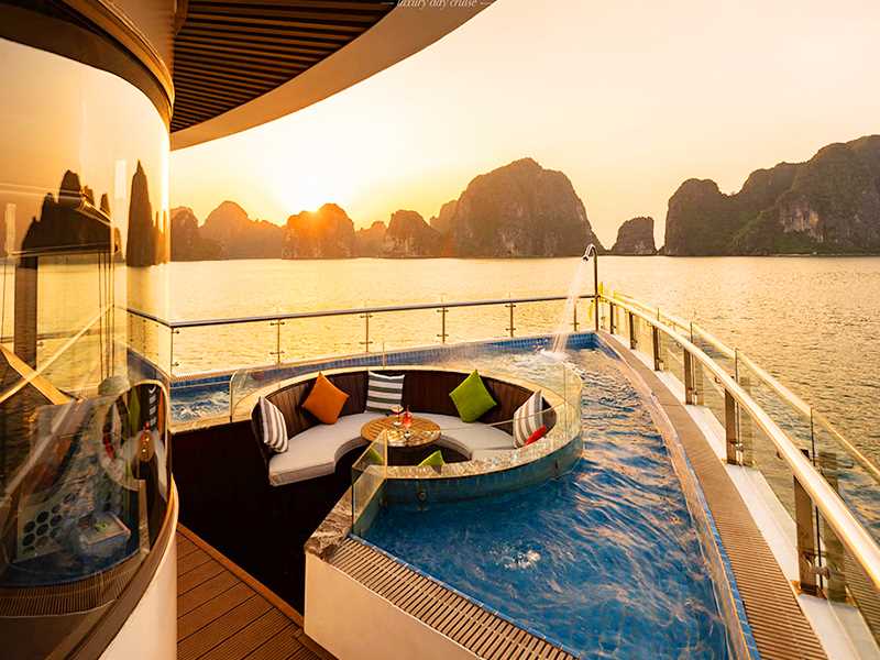 Summit on the sundeck for watch the magnificent sunset over the Seven Wonders of Nature, enjoy Sunset party. It’s ideal time to make acquaintance with new friends, sharing your traveling experience or simply watching the sunset or just relax, while cruising back to Tuan Chau Marina. Or you can choose to relax at the big Zacuzzi that located in the front of cruise.