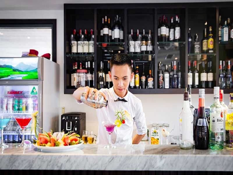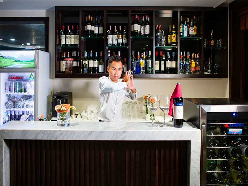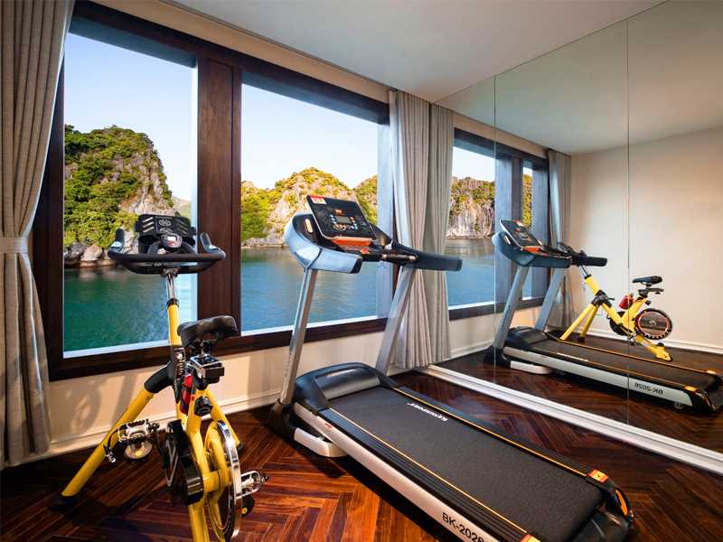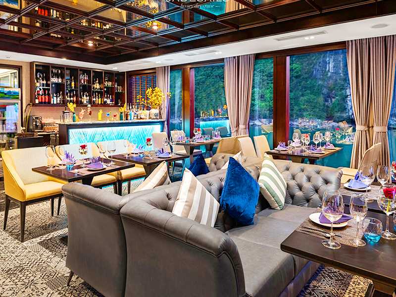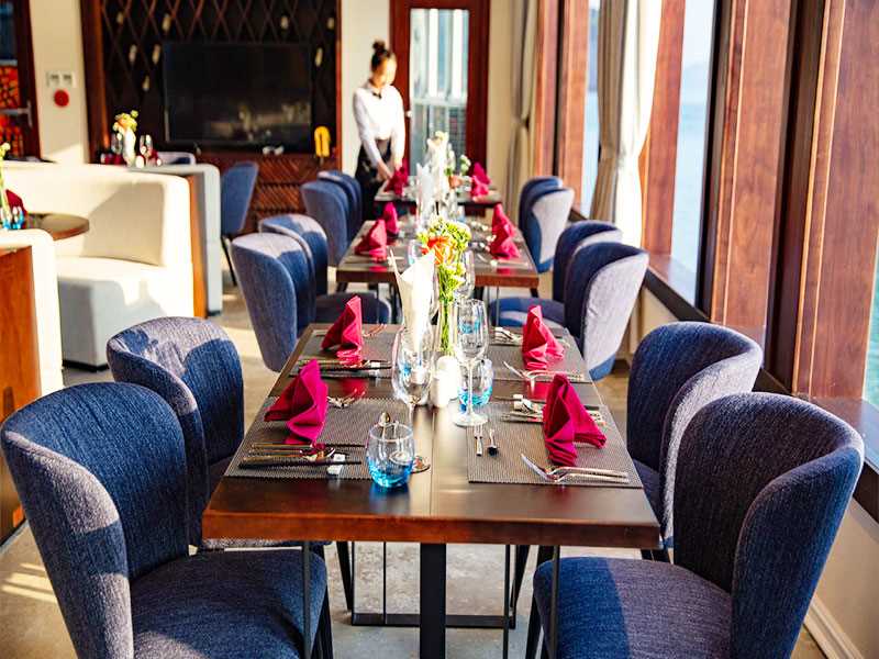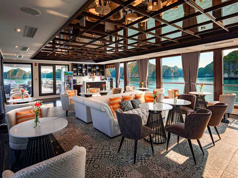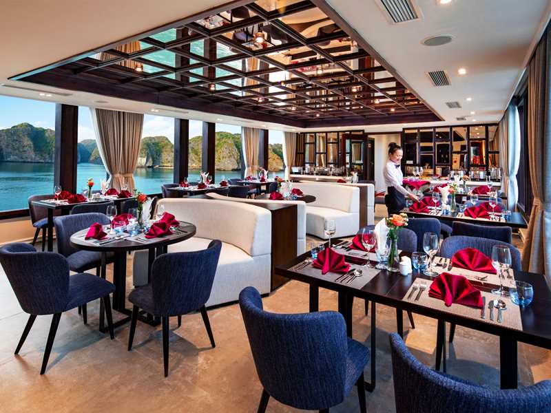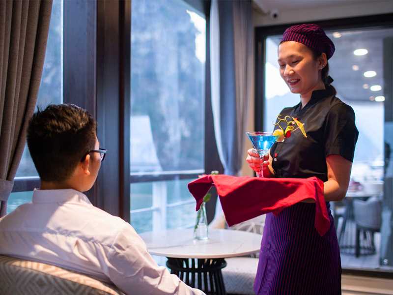 While cruising through a maze of toweling limestone mountains, you revel in the elegance restaurant that full equipped with air-conditioning. A buffet lunch (western, Vietnamese and seafood) is served and spectacular seascape is always in view through expanded windows.
